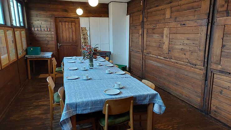 Eine schlichte Teeküche mit Kühlschrank, 2 Kaffeemaschienen, Kannen und bunt zusammengewürfeltem Geschirr (Teller, Tassen, Untertassen mit eigenem Charme ...) für etwa 40 Personen. Eine Inventarliste kann bei Bedarf zugesandt werden.