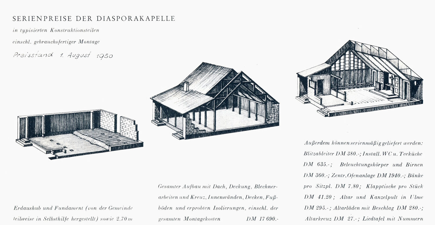 Die örtlichen Arbeiten (Erdaushub und Fundament) wurden mit 6.000 bis 8.000 DM veranschlagt, der gesamte Aufbau mit Dach, Deckung, Blechnerarbeiten, Kreuz, Innenwänden, Decke, Fußböden und Isolierungen, einschließlich Montage, kostete 17.690 DM. Türen, Fenster, elektrische Installation und alles Zubehör von Liedtafel bis Blitzableiter konnten aus dem Katalog mitbestellt werden.