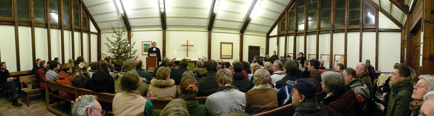 Nicht das erste Mal in diesem Jahr, dass die Kapelle voll war, aber doch eine besondere Stunde, dieser Heiligabend 2009 mit dem Winter vor der Tür, dem Holzfeuerofen, den Kerzen am Weihnachtsbaum, mit der fröhlichen handgemachten Hausmusik und der alten und immer neuen Botschaft. An die hundert Menschen waren dabei. Danke auch an alle Helfer, die den Baum gespendet, transportiert, aufgebaut, geschmückt, die den Raum vorbereitet, geheizt, Schnee geschippt haben - das waren nicht wenige, und es war nicht wenig!