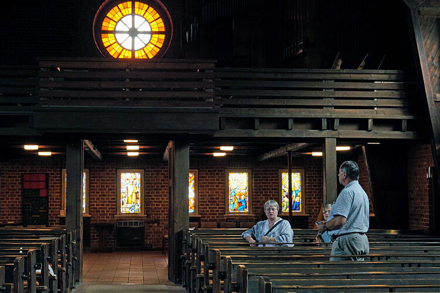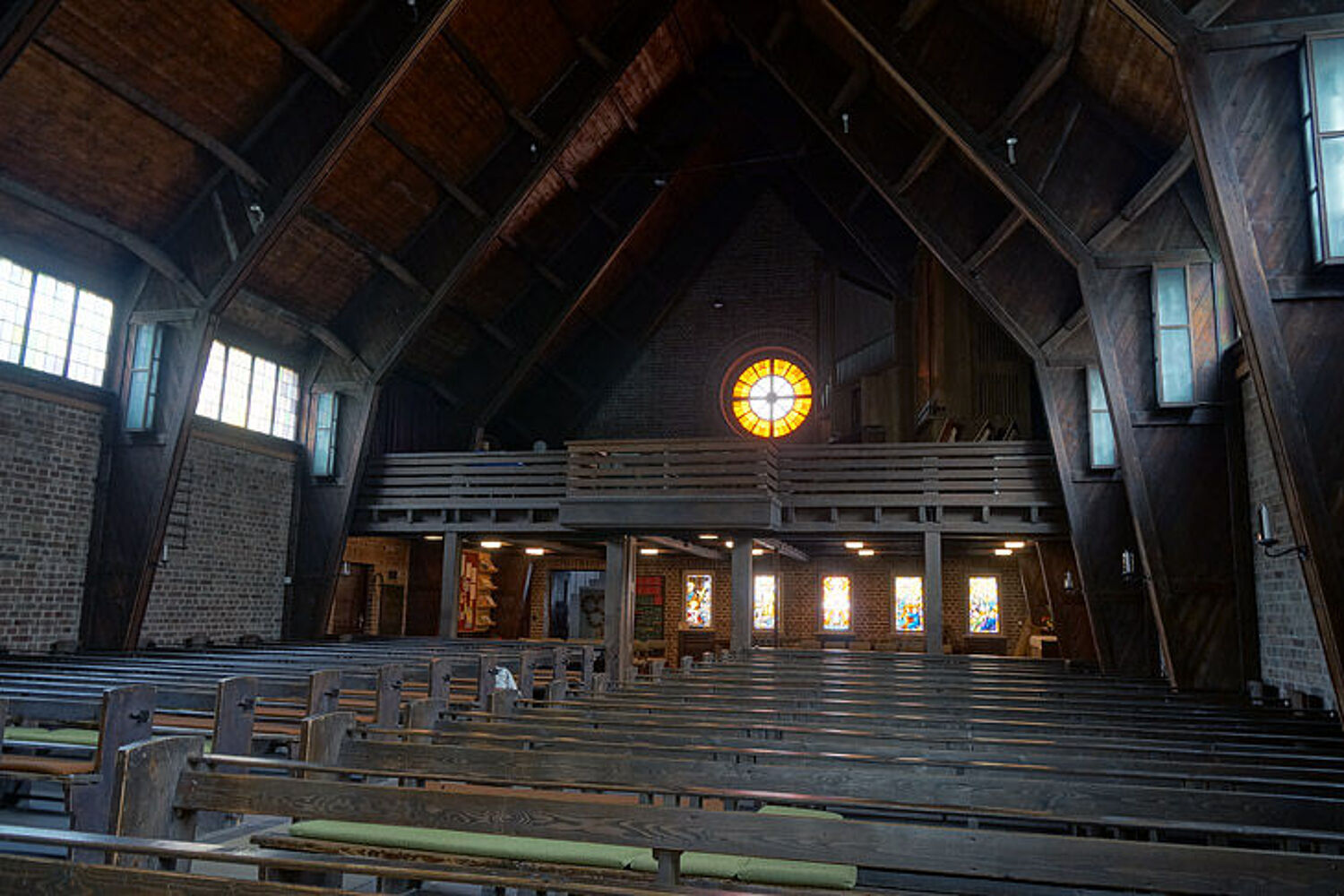 Blick in Richtung des abtrennbaren Gemeinderaumes unter der Empore und auf das Bartningsche Rundfenster.