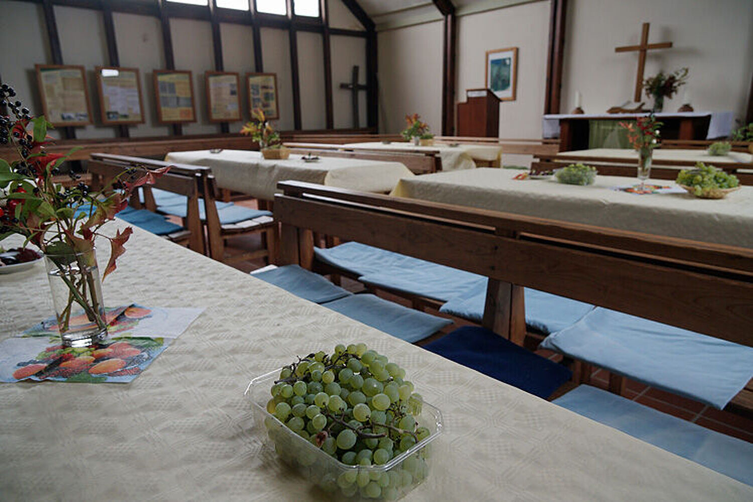 Die herbstlich-einladend vorbereiteten Tische im Kapellenraum.