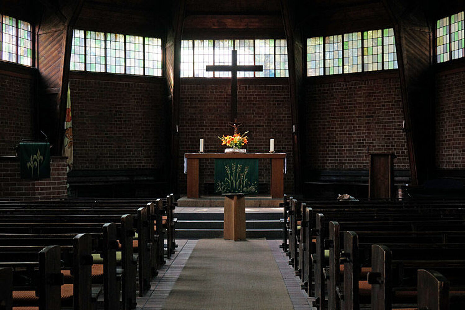 Der Altar. Die Scheiben der Fensterbänder sind vollständig original.