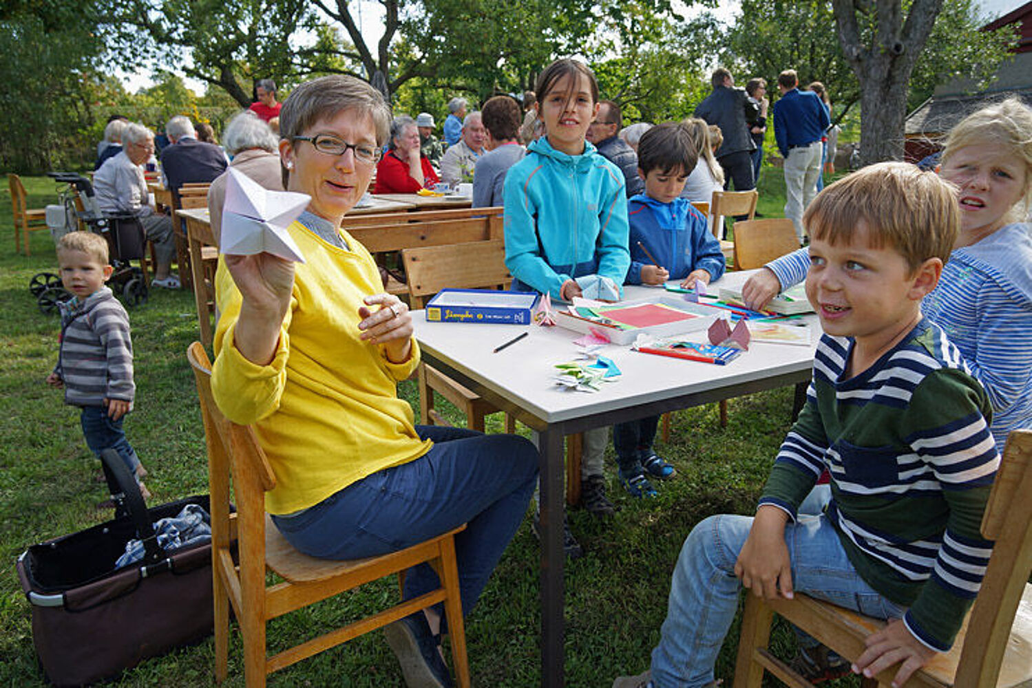 Springfrösche und Papiermonsterchen werden gefaltet. Die Kinder staunen.