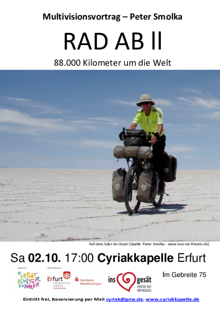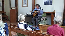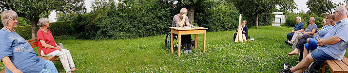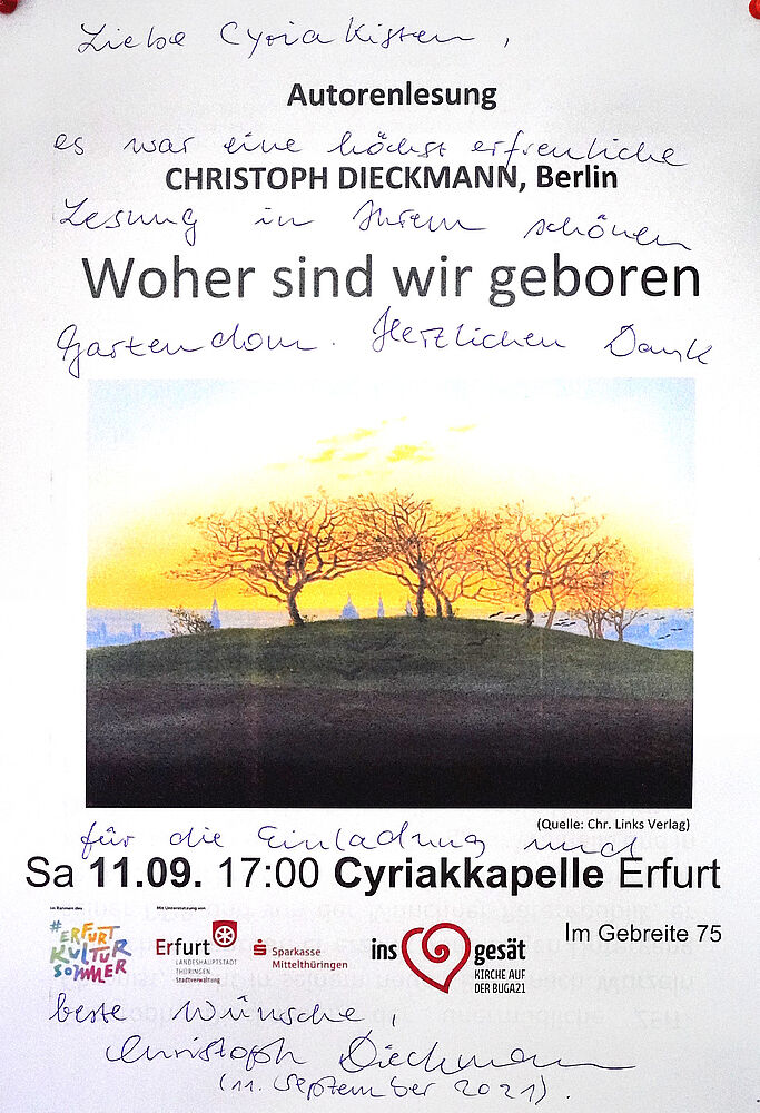 Besondere Höhepunkte waren die Kulturangebote an den Samstagen: Lesungen, Vorträge, Vernissagen und Konzerte. Dank der Unterstützung der Stadt Erfurt und der Sparkasse Mittelthüringen im Rahmen des #erfurtkultursommer konnten wir besondere Gäste begrüßen. Falk Zenkers Gitarrenklänge nahmen uns mit auf den „Falkenflug“, Christoph Dieckmann las aus seinem neuesten Buch „Woher sind wir geboren“ und den Weltumradler Peter Smolka konnten wir in einem Multivisionsvortrag auf eine Radtour rund um den Globus begleiten. Zum Abschluss las Martin Rößler unter dem Titel „Wolfes Tod und Hasenpredigt“.